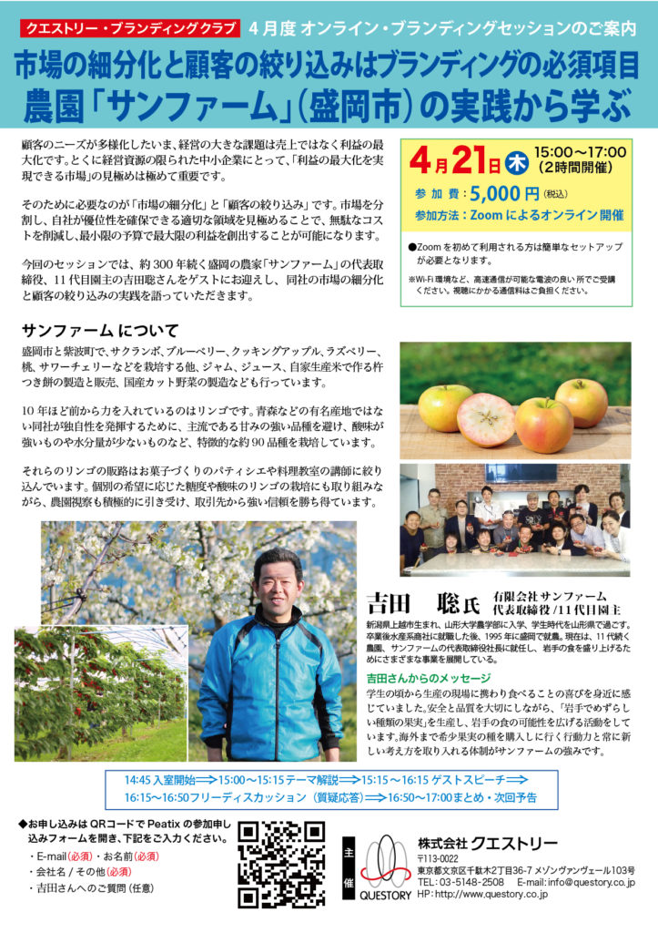 今回のセッションでは、約300年続く盛岡の農家「サンファーム」の代表取締役/11代目園主の吉田 聡さんをゲストにお迎えし、同社の市場の細分化と顧客の絞り込みの実践を語っていただきます。