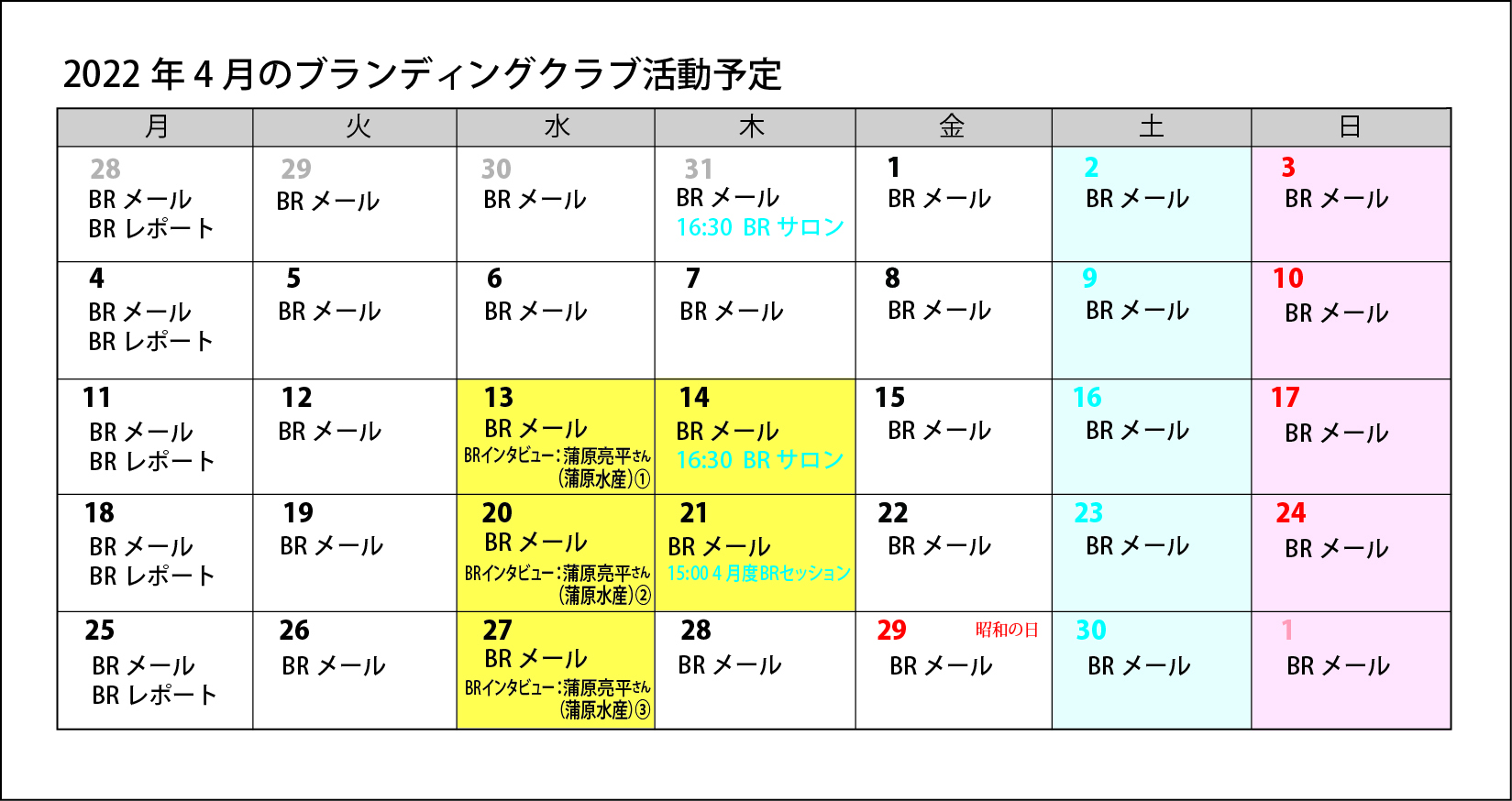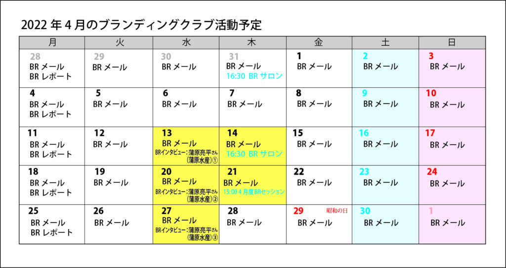 NEWS NEWS TOP 2022年4月のブランディングクラブ活動予定 2022.03.31 クラブ会員向け 2022年4月のブランディングクラブ活動予定 ■ブランディングサロン: 14(木)16:30〜17:30 ※セッション開催月のため、今月は1回です ■ブランディングインタビュー: ゲスト:蒲原水産(北海道白老町)蒲原亮平さん 1回目:13(水)、2回目:20(水)、3回目:27(水)公開 ■ブランディングセッション: ゲスト:サンファーム(岩手県盛岡市)吉田 聡さん 21(木)15:00〜17:00 ブランディングクラブについてはこちら 古い記事へ新しい記事へ 記事カテゴリー お知らせ (16) ブランディングセッション (12) クラブ会員向け (26) メディア情報 (21) ブランディングセミナー (1) BRAND de NIGHT (3)