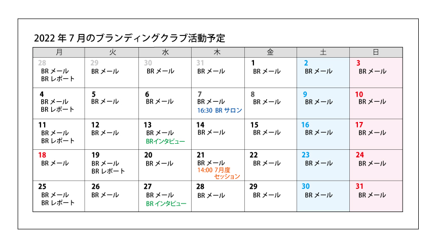 NEWS NEWS TOP 2022年7月のブランディングクラブ活動予定 2022.06.28 クラブ会員向け 2022年7月のブランディングクラブ活動予定 ■ブランディングサロン: 7(木)16:30〜17:30 ※今月はセッション開催月のため、サロンは1回です ■ブランディングセッション: 21(木)14:00〜16:00 ■ブランディングインタビュー: 13(水)、27(水)公開 ※状況により、変更の可能性あり ブランディングクラブについてはこちら 古い記事へ新しい記事へ 記事カテゴリー お知らせ (16) ブランディングセッション (12) クラブ会員向け (26) メディア情報 (21) ブランディングセミナー (1) BRAND de NIGHT (3)