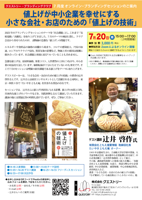 セッションでは、辻井さんに値上げが経営に与える影響、値上げの本質と目的、具体的な値上げのノウハウなどを、実践事例も交えて講演していただきます。講演の後には質疑応答の時間も設けています。ぜひ、ご参加ください。